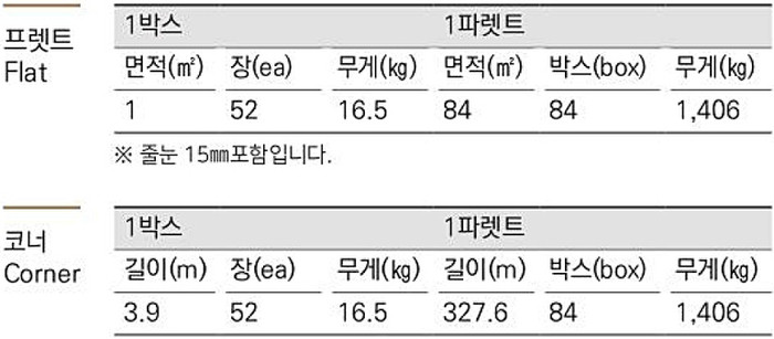 1박스: 52장/1㎡(15㎜줄눈기준)