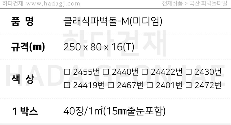 1 BOX 40장/1㎡(15㎜줄눈포함)